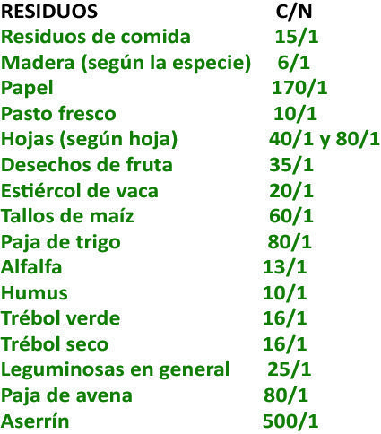 Un ejemplo que os planteamos, sabemos que el estiércol de vaca tiene una relación C/N de 20:1 y los residuos de frutas una C/N de 35:1. Si añadimos al compostador dos kilos de estiércol y un kilo de frutas resulta= (20:1 +20:1+ 35:1) = (75:1)/3= 25:1, es así que la mezcla resultante de lo aportado seria de 25:1, como sabemos que 30:1 es lo ideal deberíamos aportar un poco de otro residuo que nos aportara algo más de carbono. Es así de sencillo.
